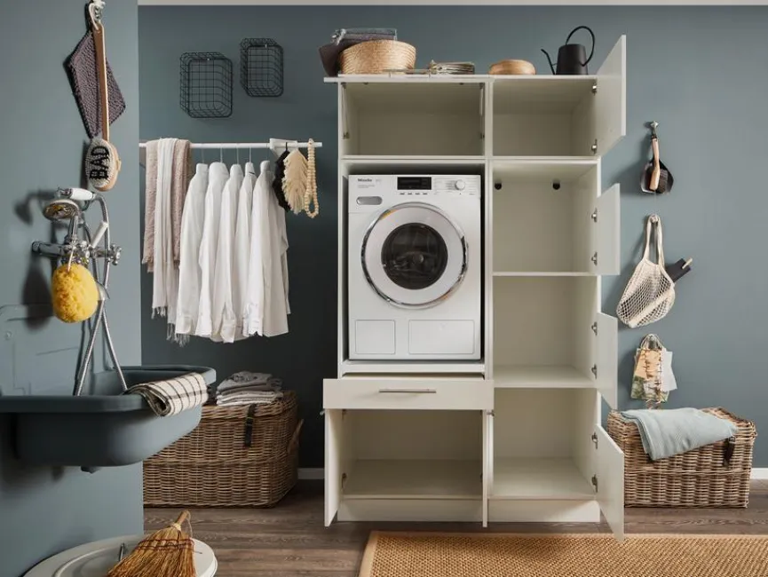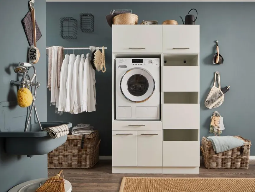 - HWR-Kombination aus Hochschrank, Wäscheschrank und 2 Aufsatzschränken