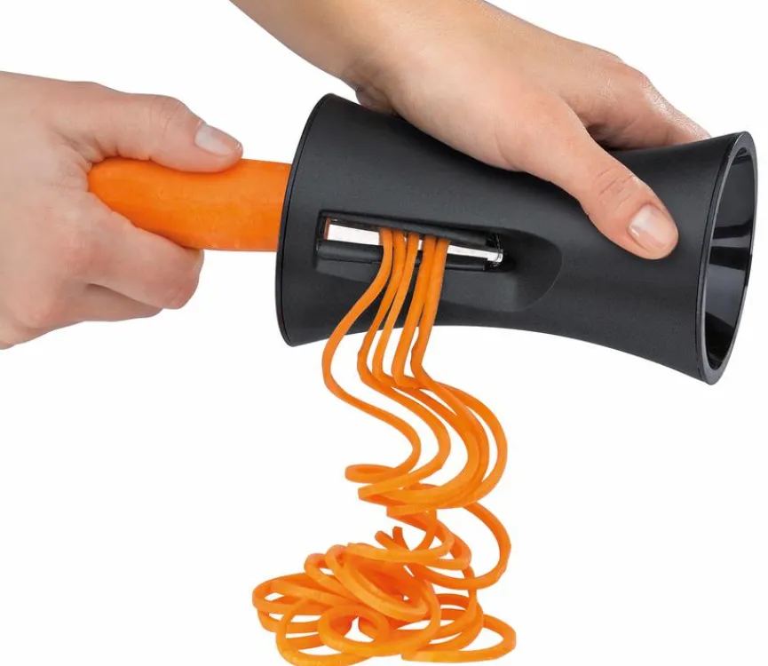 - Mit 2 extra scharfen Messern, in zwei Stärken, Restehalter und Reinigungsbürste