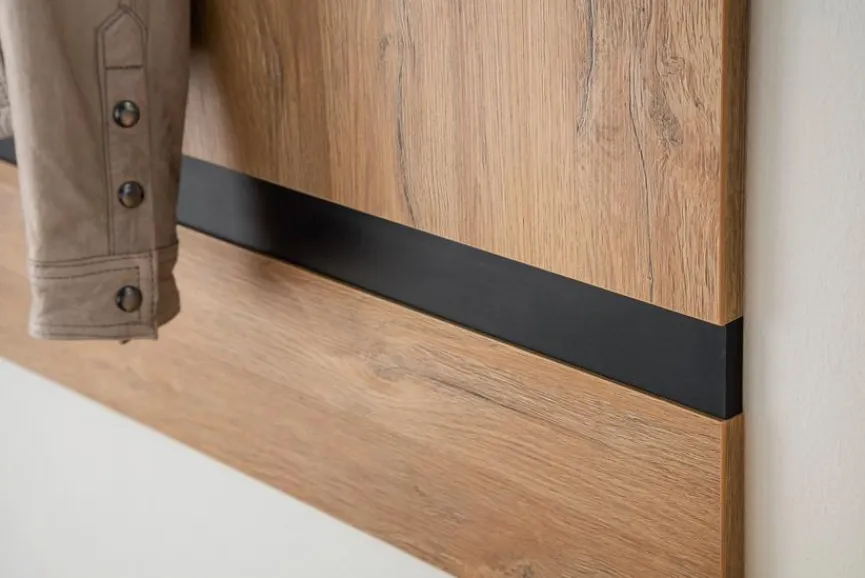 Der Eingangsbereich ist die Visitenkarte eines Hauses, sagt man. Das Garderobenpaneel Toledo von MCA sorgt für einen besonders guten ersten Eindruck. Außerdem schafft das Dielenpaneel mit drei Haken, Kleiderstange und Hutablage für jedes Kleidungsstück einen aufgeräumten Platz. Das Garderobenpaneel Toledo präsentiert sich mit fein gemasertem Holz und im geradlinigen Design von MCA, was seine Hochwertigkeit noch unterstreicht.