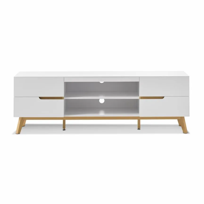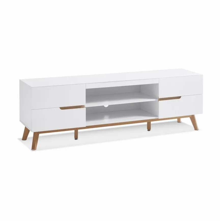 Das Lowboard Cervo der Marke MCA begeistert durch eine hochwertige Verarbeitung und ein pfiffiges Äußeres. Die typisch skandinavische Optik des Sideboards wird durch den gelungenen Kontrast zwischen dem Naturholz-Gestell und dem lackierten Korpus bestimmt. Mit den verschiedenen Fächern ermöglicht das Lowboard Cervo von MCA ein einfaches Verstauen von Dingen wie Fernbedienung, DVD-Player und Co.