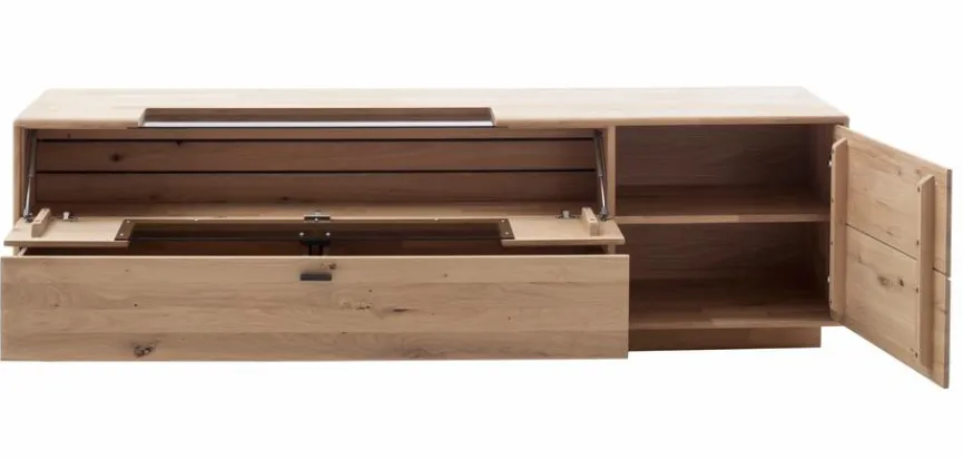 - Korpus aus Ast/Balkeneiche massiv keilgezinkt in Kristalleiche geölt, Front aus Ast/Balkeneiche massiv durchgehende Lamelle in Kristalleiche geölt