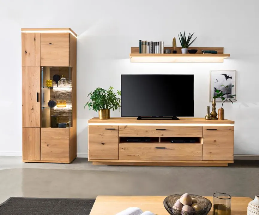 - LED-Beleuchtung vom Oberboden vom TV-Lowboard und der Vitrine ist inklusive. Sonstige Beleuchtung und Zubehör ist optional gegen Mehrpreis erhältlich