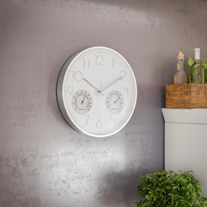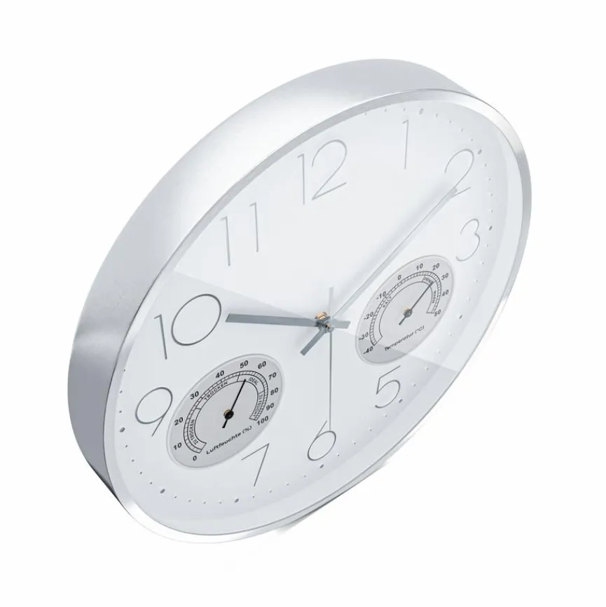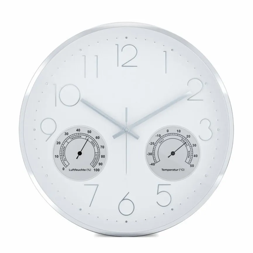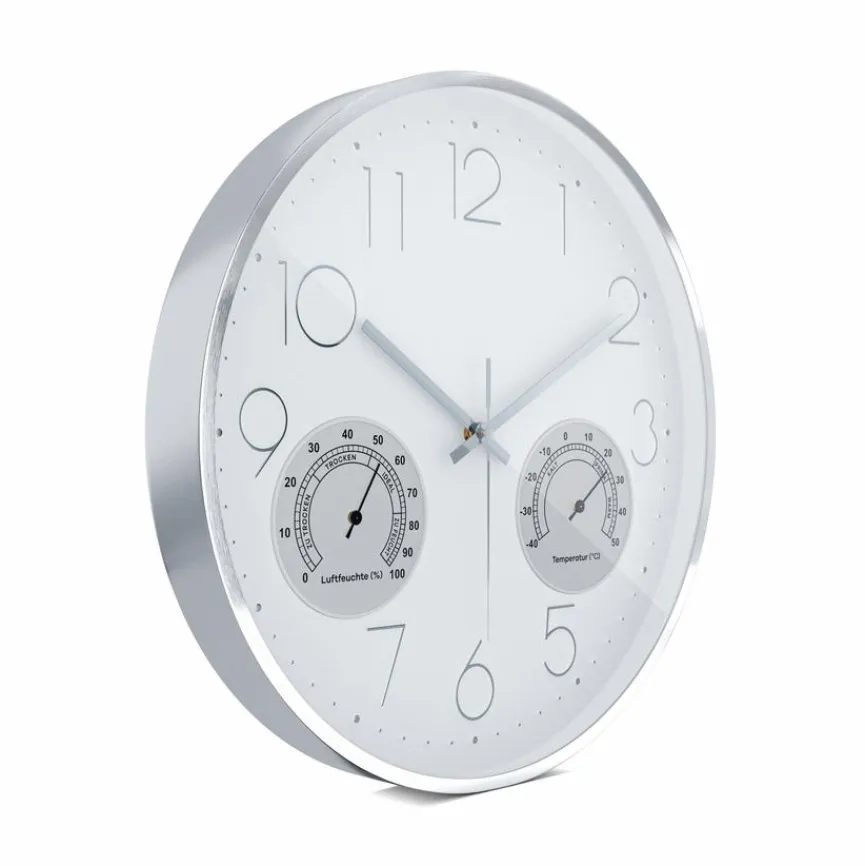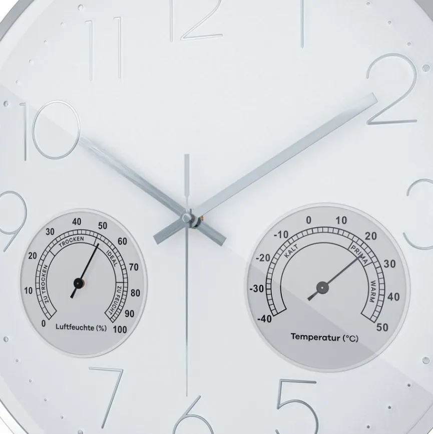Dank der großen arabischen Ziffern bietet die Quarzwanduhr 12913 Ø 35 cm von Mebus eine gute Ablesbarkeit. Ziffern im 3D-Design und Zeiger aus gebürstetem Aluminium verleihen dem Zeitmesser eine moderne Ästhetik, die zu vielen zeitgemäßen Wohnstilen passt. Die Quarzwanduhr 12913 Ø 35 cm wartet zusätzlich mit einem Thermo- sowie einem Hygrometer zur Anzeige der Raumtemperatur und Luftfeuchtigkeit auf.