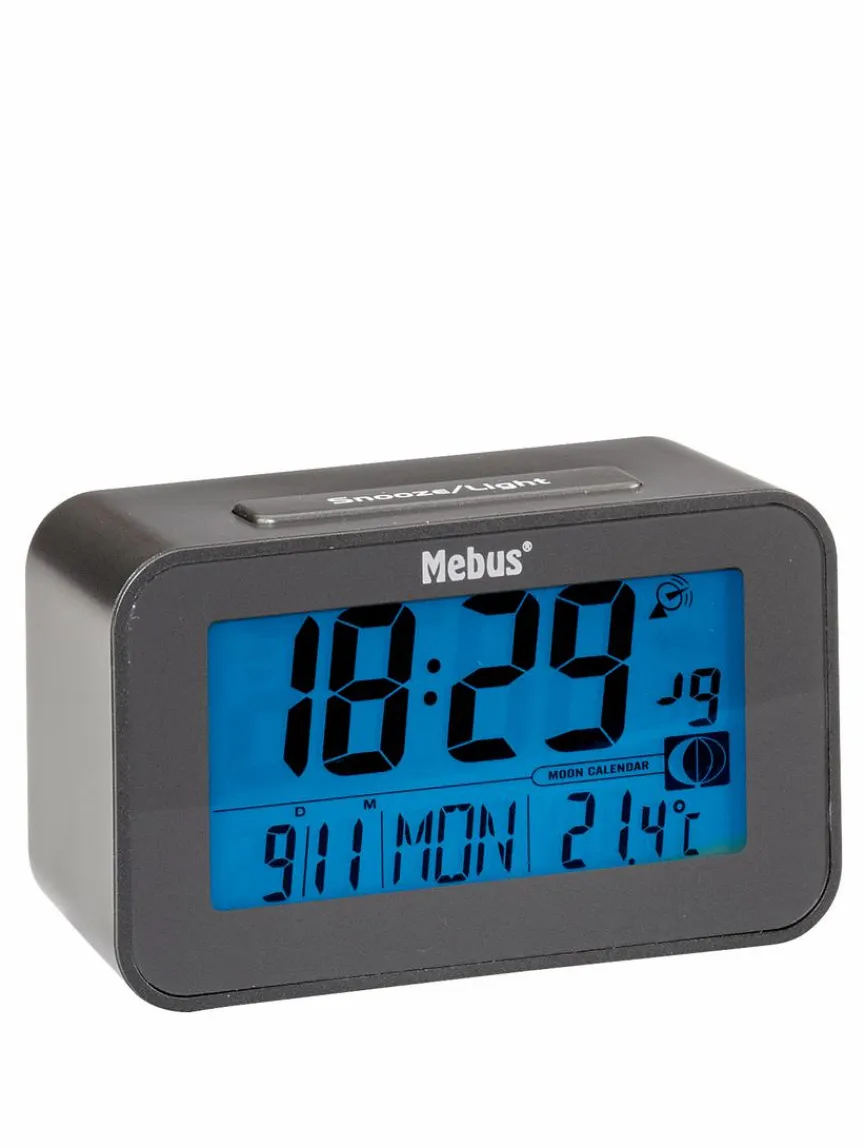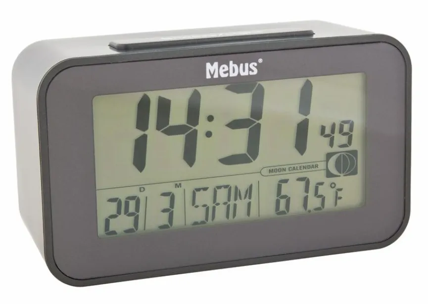 Dank des Weckers 51460 von Mebus werden Sie nie wieder verschlafen, denn er sorgt zuverlässig dafür, dass Sie rechtzeitig aufwachen. Insbesondere auf Reisen lässt er sich aufgrund seiner Kompaktheit gut einsetzen. Große, gut lesbare Ziffern zeigen Ihnen die Uhrzeit an und auch darüber hinaus hält das Display viele Informationen für Sie bereit. Beispielsweise zeigt der Mebus Wecker 51460 die Mondphasen und die Raumtemperatur an.