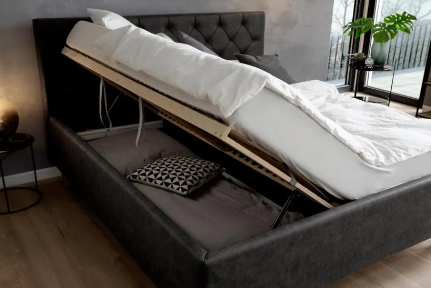 - Inklusive belüftetem Bettkasten und seitlich klappbaren Federholzrahmen, 28 Leisten unverstellbar mit 5-facher Härtegradverstellung