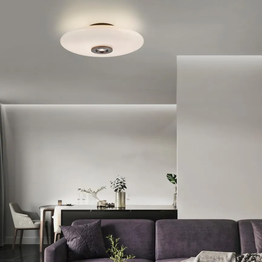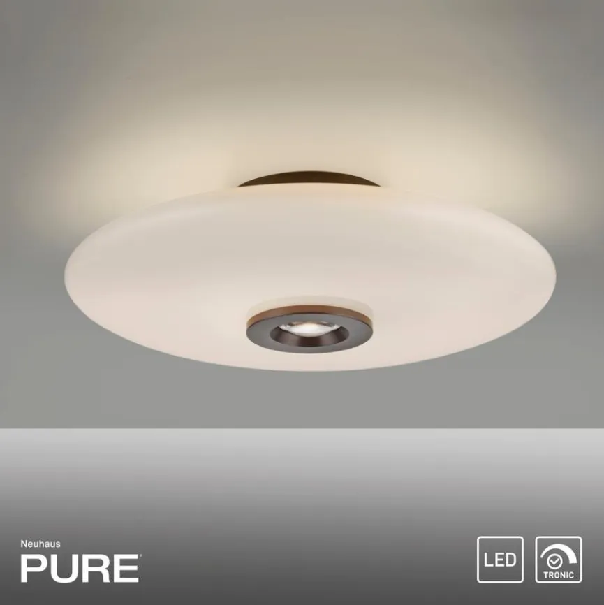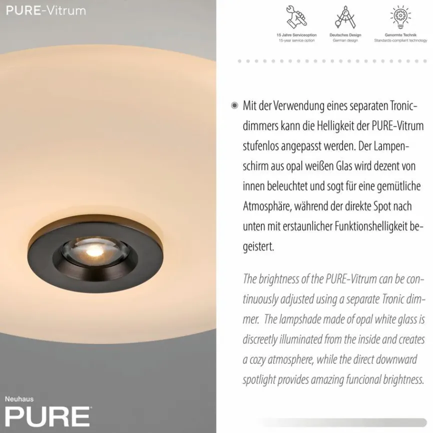 Die Deckenleuchte Pure Vitrum von Neuhaus PURE überzeugt mit ihrer Funktionalität und einem schlichten, modernen Design. Der runde Glasschirm der Deckenlampe sorgt für eine gleichmäßige Beleuchtung, wobei sowohl direktes Licht nach unten als auch indirektes Raumlicht erzeugt wird. Diese Kombination macht die Deckenleuchte Pure Vitrum ideal für Wohn- und Schlafräume.