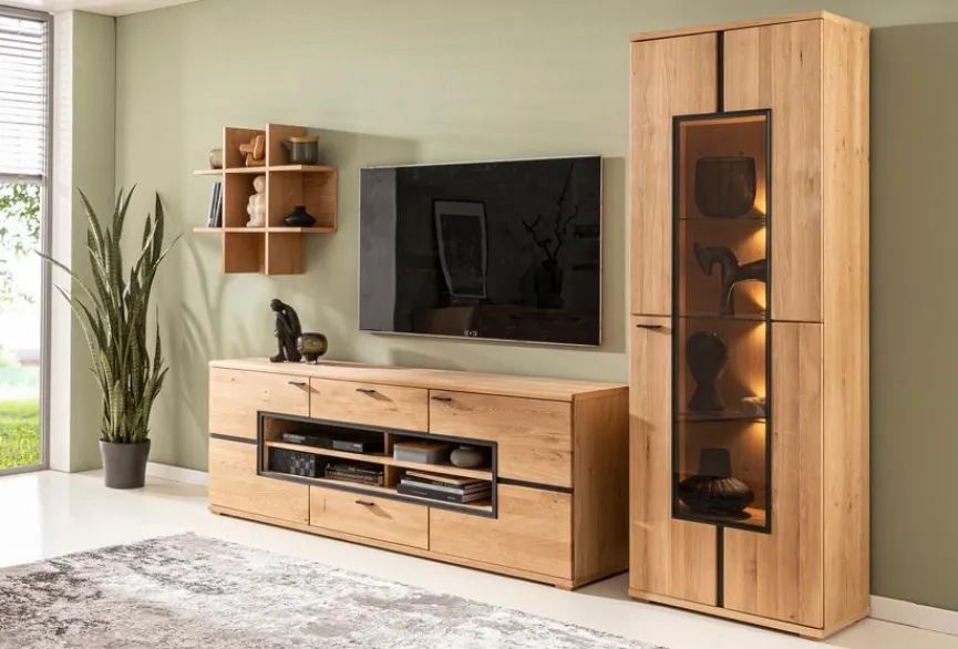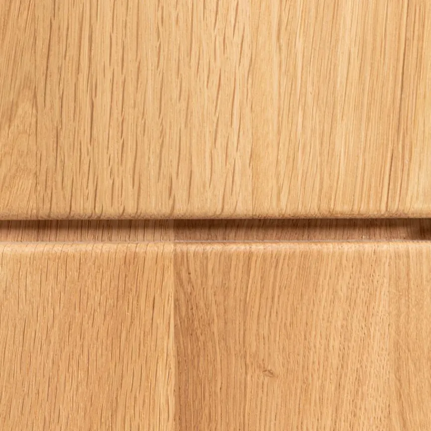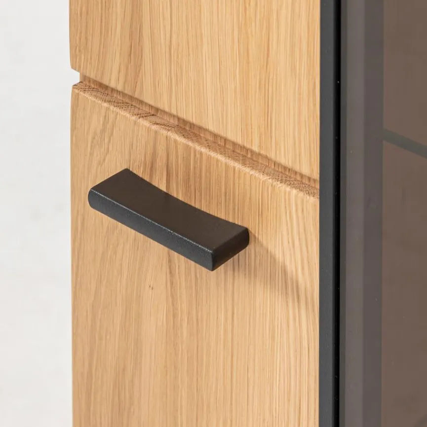 - Front aus vollmassiver Wildeiche, Korpus aus Holzwerkstoff (Spanplatte) mit hochwertiger Dekorfolie in Wildeiche furniert, Absetzung aus geölter Natureiche mit Ornament in Anthrazit