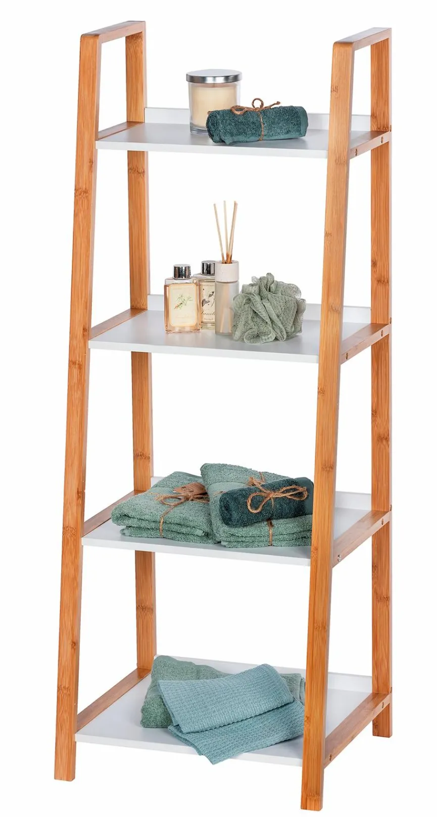 Für Übersichtlichkeit im Badezimmer sorgt das hochwertige Badregal Finja von WENKO, denn mit vier Ablageflächen bietet es Stauraum für diverse Utensilien wie etwa Handtücher, Zahnputzbecher oder Cremedosen. Auch in puncto Optik überzeugt das aus Bambus gefertigte Badezimmerregal, dessen Design angenehm puristisch und zeitlos wirkt. Das deutsche Unternehmen WENKO beweist mit Möbeln wie dem Badregal Finja, dass Minimalismus und Funktionalität jeden Haushalt bereichern.
