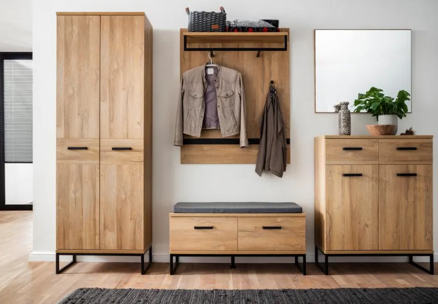 - Garderobe aus Garderobenschrank, Schuhschrank, Garderobenpaneel, Spiegel und Garderobenbank