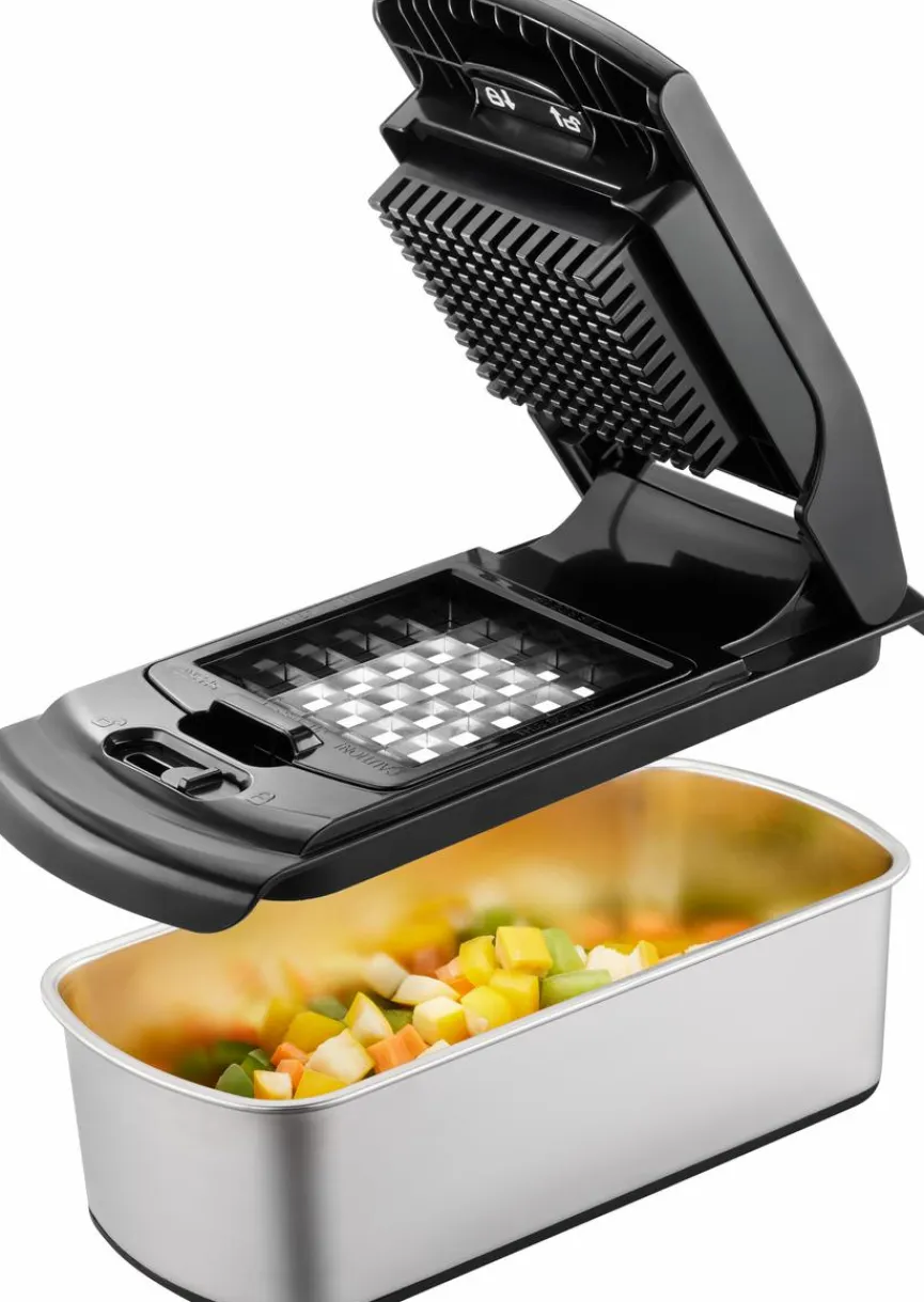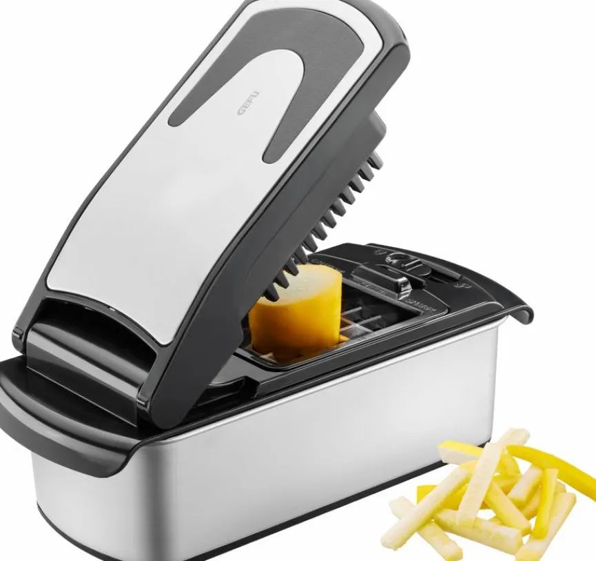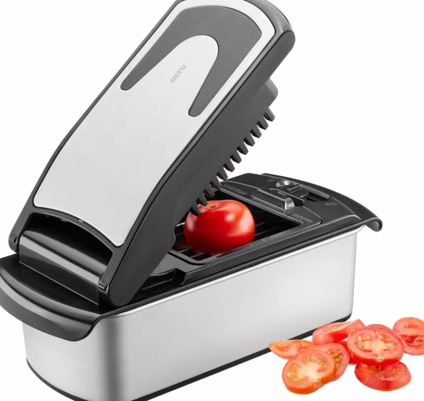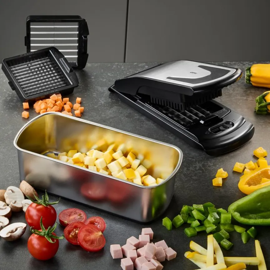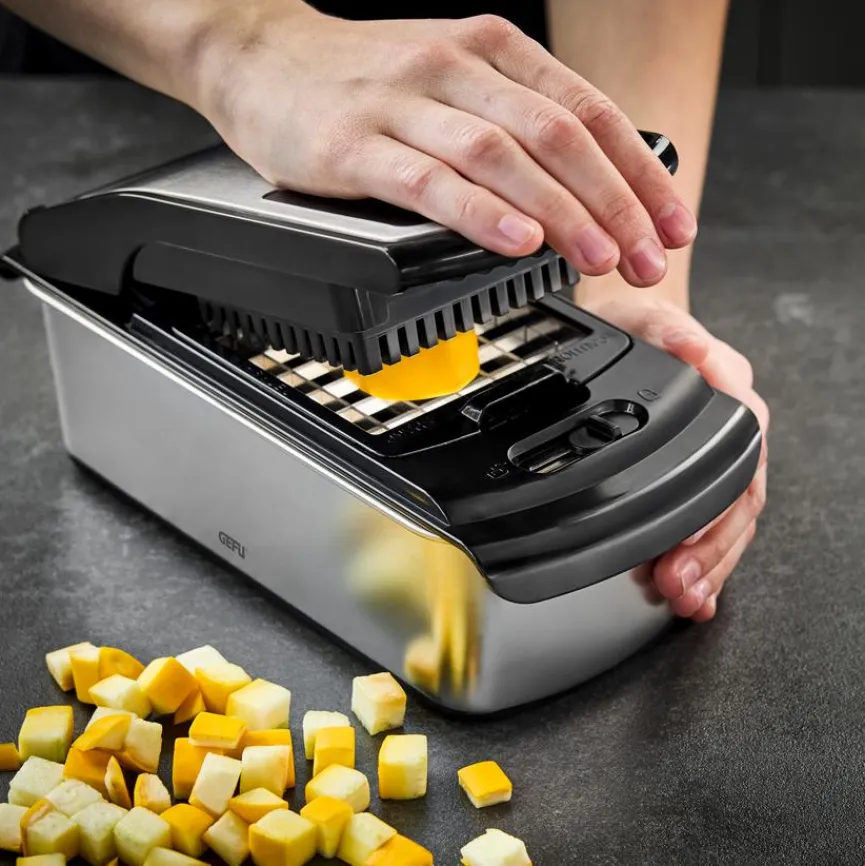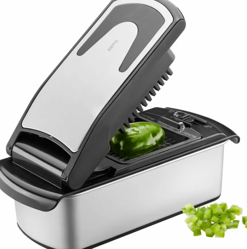 Mit dem Gemüsewürfler Treppo 2.0 der Marke GEFU sind Sie optimal gerüstet, um in Ihrer Küche auf bequeme Art und Weise das Gemüse für das Essen der Familie zuzubereiten. Der Gemüseschneider verarbeitet zum Beispiel Paprika, Zuccini oder Tomaten zu Stiften oder Würfeln. Nach getaner Arbeit lässt sich der Gemüsewürfler Treppo 2.0 problemlos mit dem beigefügten Reinigungskamm von Gemüserückständen befreien.
