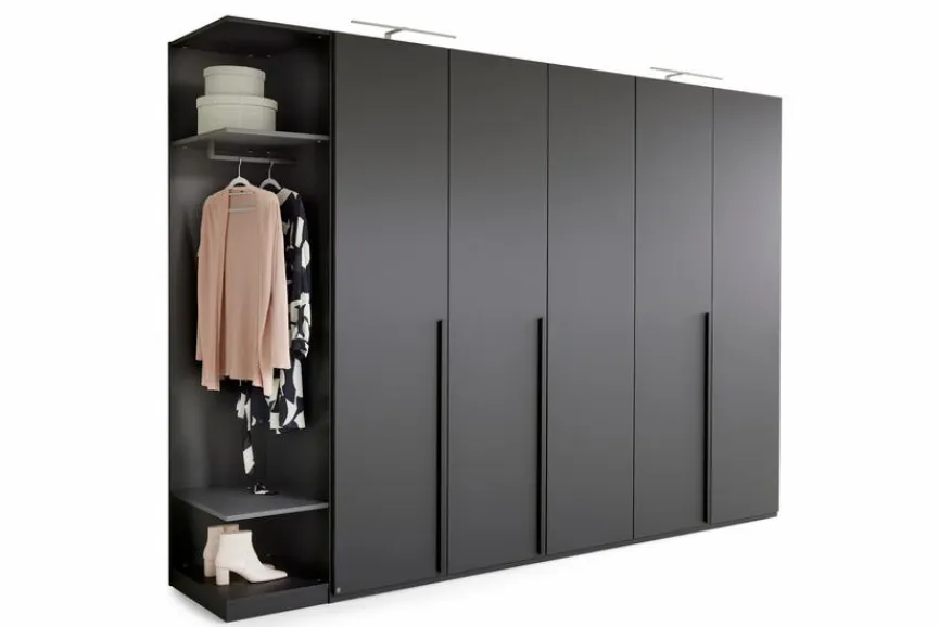 Der Kleiderschrank Montino aus dem Hause Musterring spiegelt die Klasse des Produktdesigns des Herstellers auf subtile Art wider. Schon das offene Garderoben-Seitenteil des Schlafzimmermöbels zeigt die Sensibilität für praktische Extravaganz. Punkten kann der Kleiderschrank Montino auch dank seines mit dem äußeren Erscheinungsbild kontrastierenden lackierten Innenlebens.