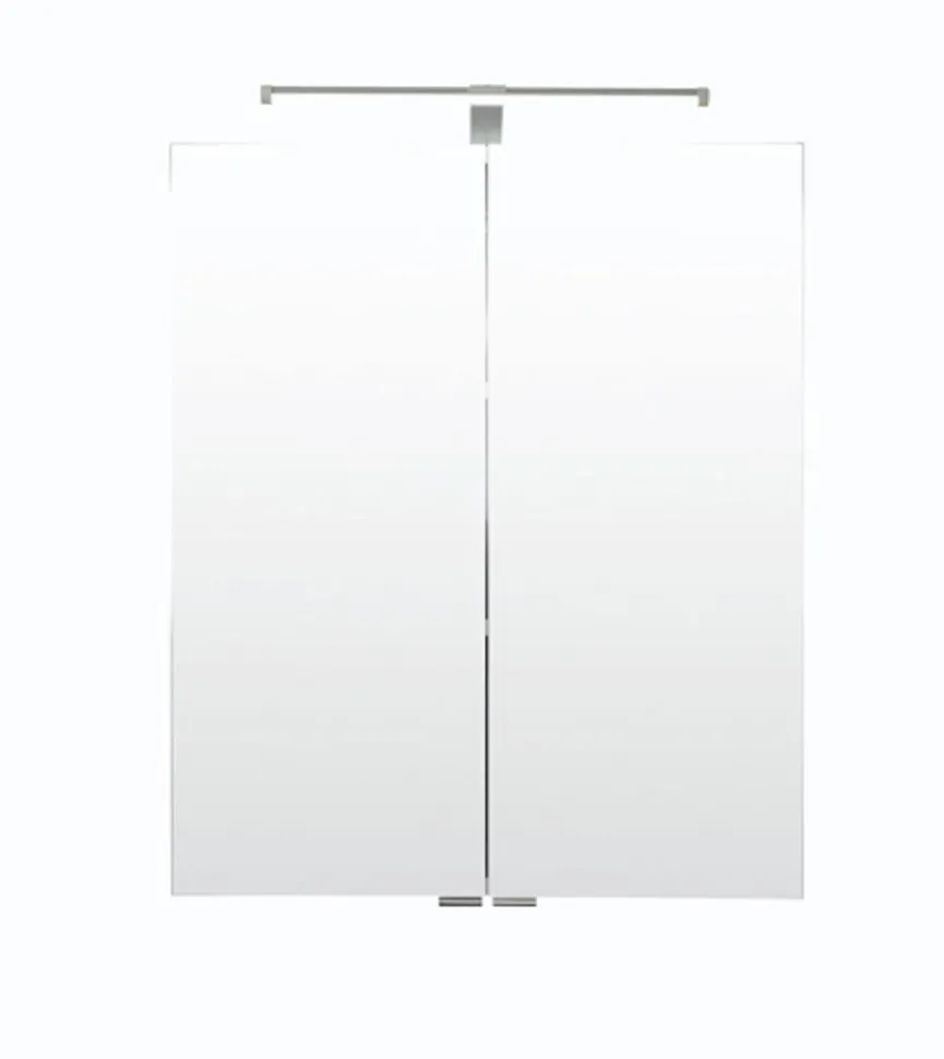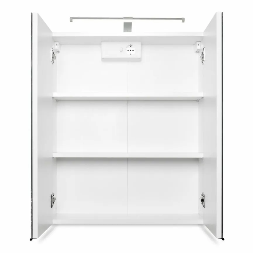 Der Spiegelschrank 038.1.0001 bietet dank der zwei Holzeinlegeböden, die sich hinter den Türen mit aufeklebten Spiegeln befinden, ausreichend Platz für Make-up, Parfüm oder Zahnbürsten. Die dazugehörige LED-Leuchte spendet genug Licht zum Schminken und Frisieren. Mit der schlichten Optik lässt der Spiegelschrank 038.1.0001 viel Spielraum bezüglich der Kombination mit anderen Möbeln oder Dekoartikeln. Außerdem verfügt er über eine integrierte Steckdose.