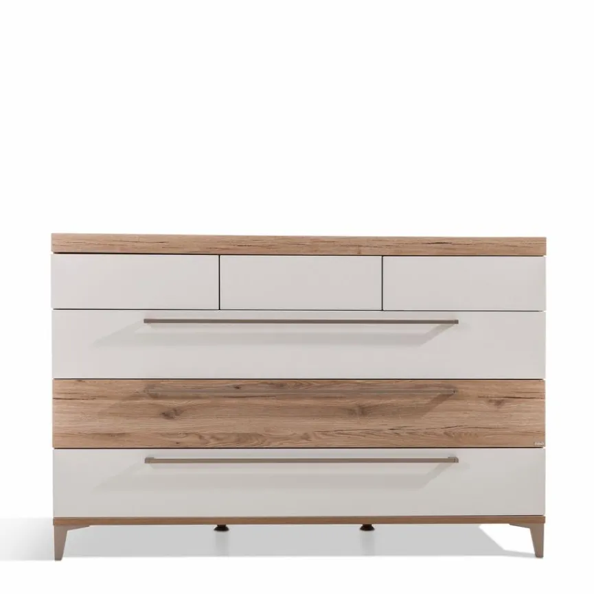 - Mit 2 breiten Schubkästen in Kreideweiß und 1 breiten Schubkasten in Eiche-Bordeaux unten