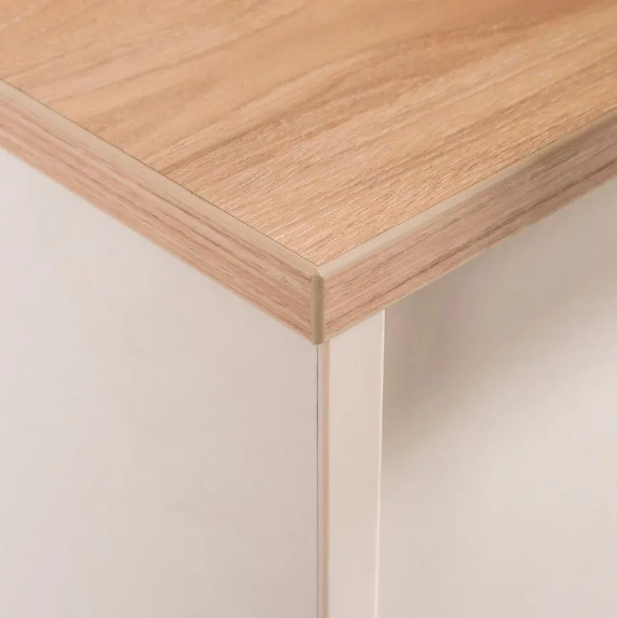 - Aus Holzwerkstoff (Spanplatte) mit kratzfester Melaminharzfolie in „Satin“, Absetzung und sichtbare Rückwände aus Holzwerkstoff (Spanplatte) mit kratzfester Melaminharzfolie in „Virginia Chestnut“