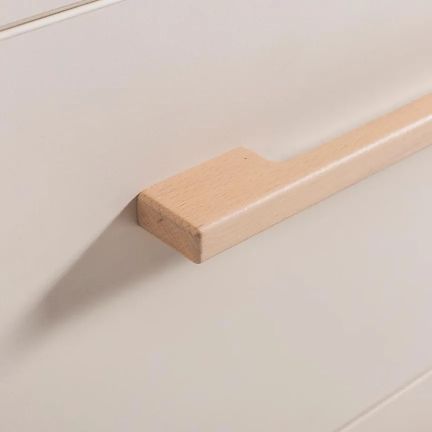 - Rückwände hinter Türen und Schubkästen aus Holzwerkstoff (HDF) in weiß, Griffe und Füße aus massiver und in „Virginia Chestnut“ lackierter Buche