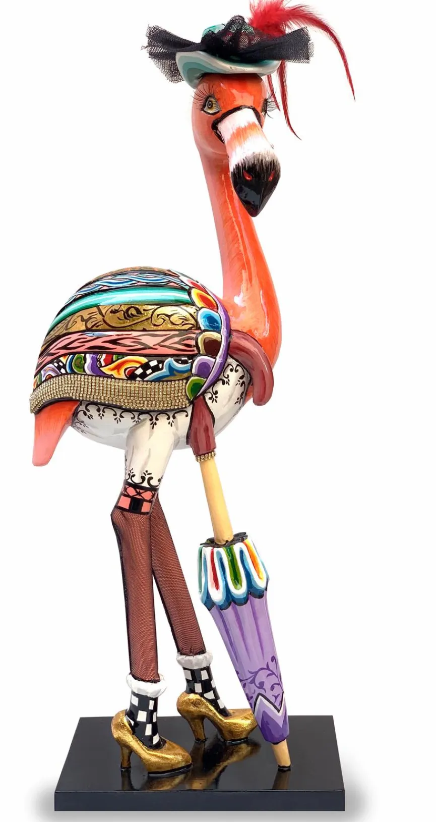 Finden Sie nicht auch, dass der farbenprächtige Deko-Flamingo Felicity mit seinem schicken Schirm, dem federbesetzten Piratenhut, den Rautenmuster-Socken und den High Heels ein sehr kokettes Vögelchen abgibt? Geben Sie ihm doch ein schönes Plätzchen in Ihrem Wohnbereich, auf dem Fensterbrett oder in Ihrem Wintergarten. Sie können sich sicher sein, dass der Deko-Flamingo Felicity jedem seiner Betrachter ein Lächeln ins Gesicht zaubert.