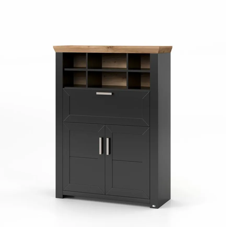 - Front aus Holzwerkstoff (MDF) in Graphit, Korpus aus Spanplatte mit kratzfester Melaminharzfolie in Graphit, Absetzung in Artisan Eiche Dekor