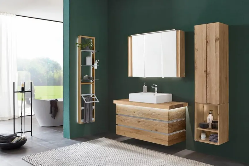 - Waschtischplatte aus massiver Eiche mit Aufsatzbecken Keramik weiß, mit Armaturbohrung und Überlauf, 1 Raumsparsiphon, 1 Permanentablauf inkl. Abdeckung in chrom