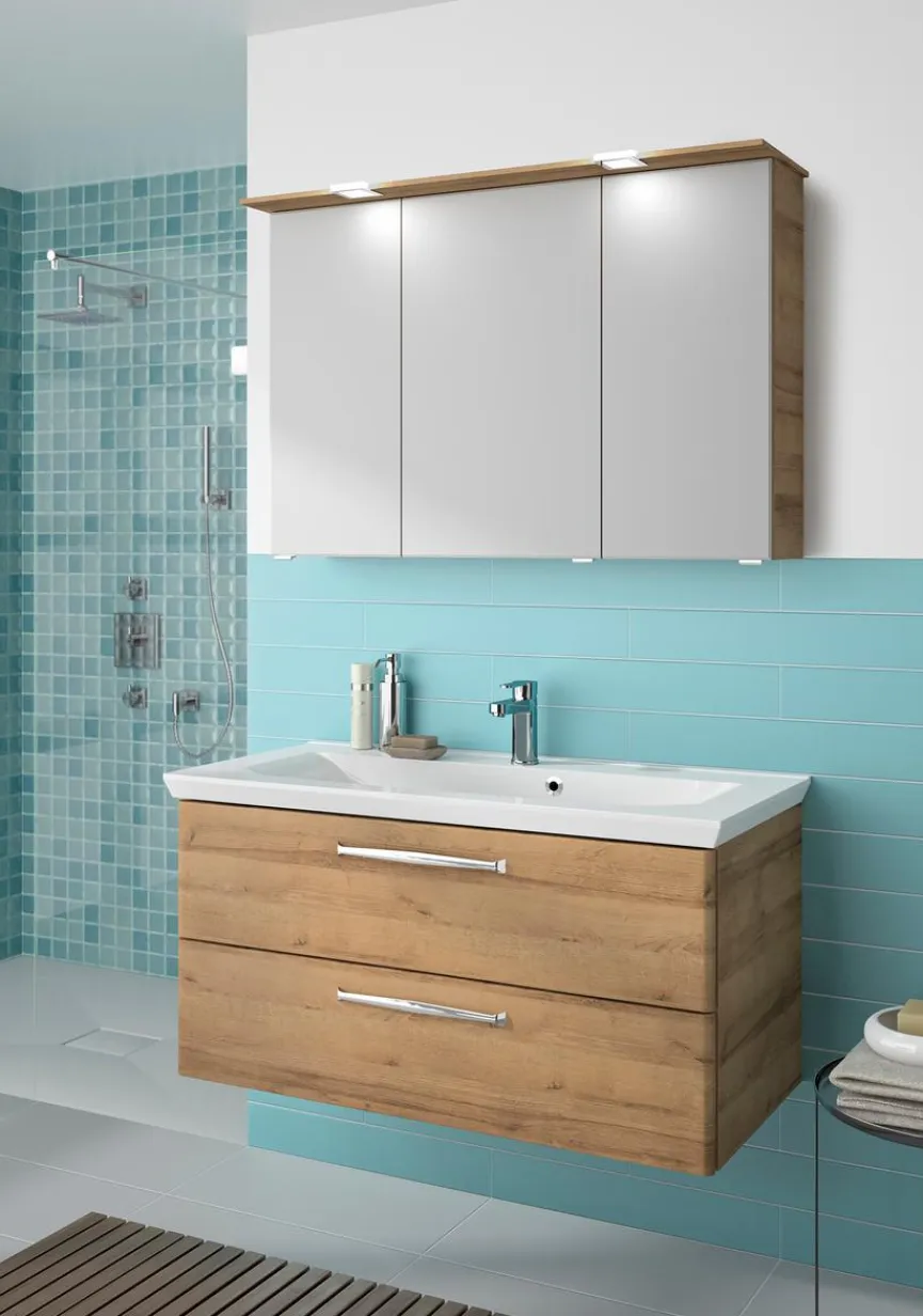 - Bestehend aus Spiegelschrank mit 3 Türen, 6 Glaseinlegeböden, inklusive LED-Aufbauleuchte mit Schalter-Steckdosen-Element