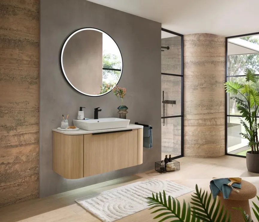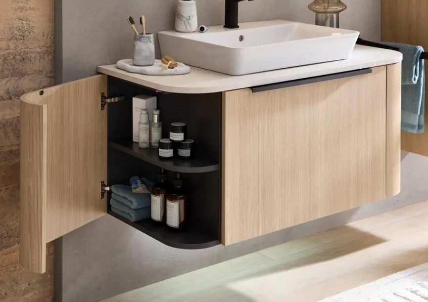 - Mit Waschtischplatte inklusive Ausschnitt für Aufsatzbecken, Verbundplatte mit Schichtstoff belegt, Ausführung Sandstein Struktur Nachbildung