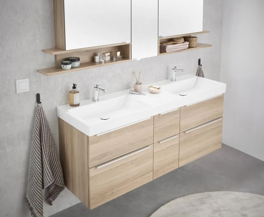 - Inkl. Keramik-Doppelwaschtisch q!flat in weiß, inkl. 2x Clou Ab- und Überlaufsystem (Clou-Abdeckung in weiß)
