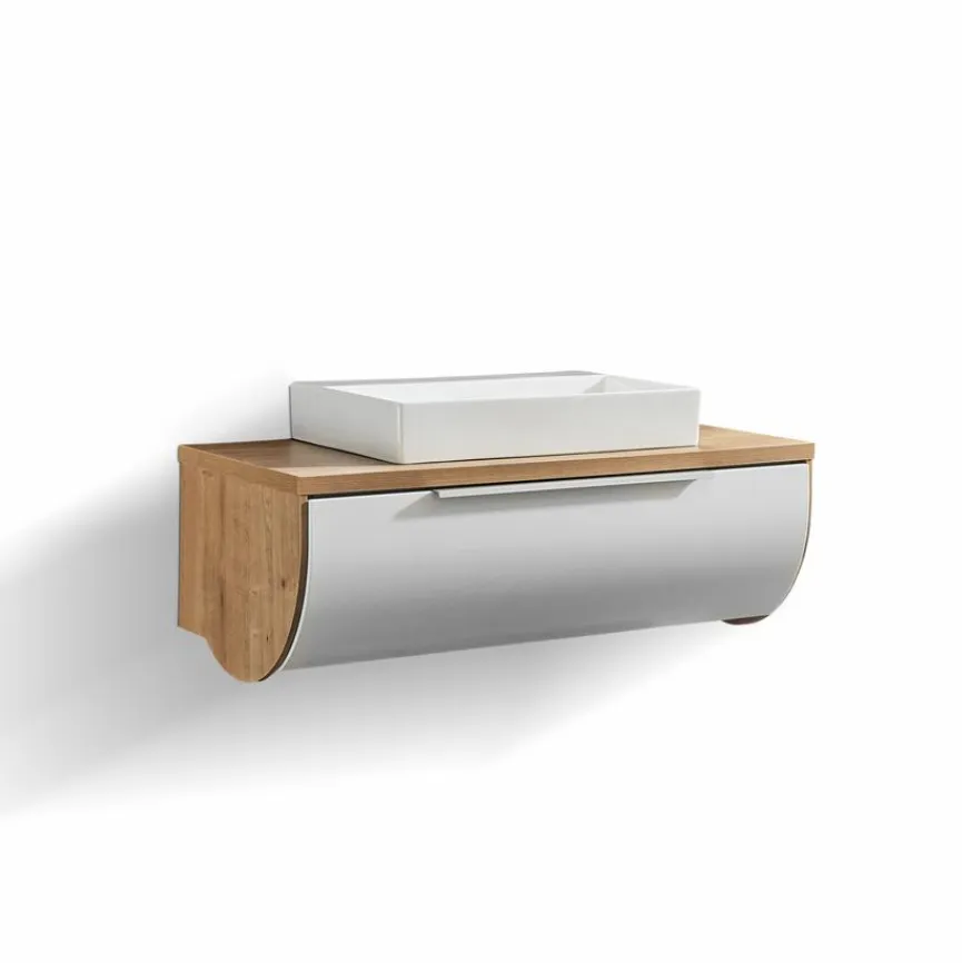 - Kombination bestehend aus Waschtischunterschrank mit 1 Metallauszug mit Einzugsdämpfung und Siphonausschnitt, 1 Waschtischplatte mit Ausschnitt für Waschtisch und 1 Aufsatzwaschtisch aus Keramik mit Hahnlochbohrung und Überlauf