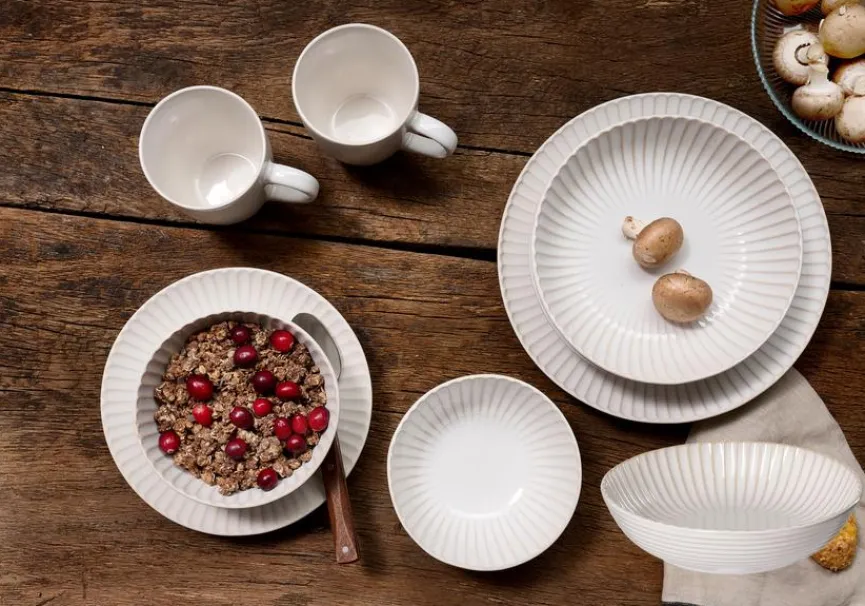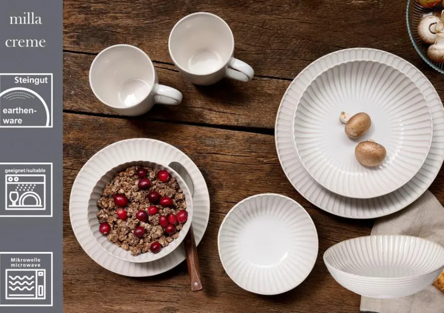 Für Interior-Enthusiasten, die Naturmaterialien, einen schlichten Look und eine Prise Purismus lieben, ist das Tafelservice Milla 8tlg. von Ritzenhoff & Breker ein Style-Highlight. Dieses traumhafte Tafelgeschirr bezaubert mit seiner muschelartigen Reliefstruktur und besticht durch seine exklusive Fertigung. Steingut wurde mit Reaktivglasur veredelt, die während des Brennvorgangs leicht variierende Nuancen und Texturen hervorruft, und dem Tafelservice Milla 8tlg. ein faszinierendes, einzigartiges Design beschert.