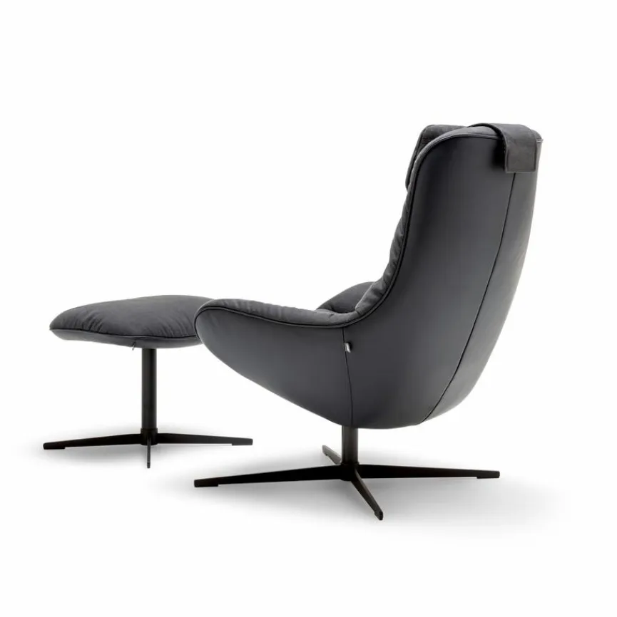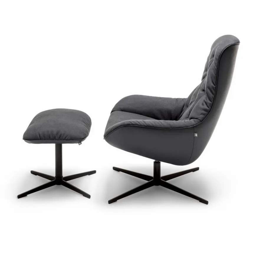 - Sitzbezug aus Stoff in schwarzgrau (17.353), Korpusbezug aus Leder in graublau (38.109), Kreuzfuß pulverbeschichtet in RAL9017 verkehrsschwarz