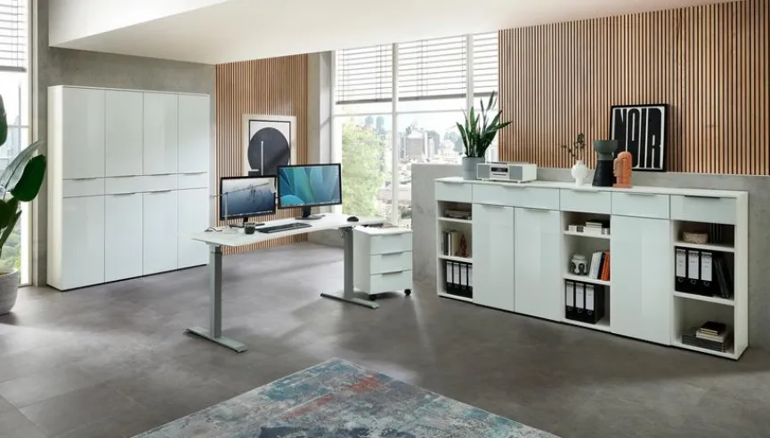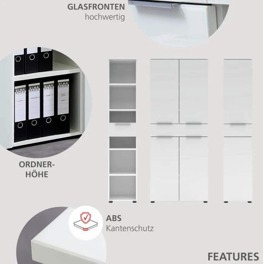 - Aus Holzwerkstoff (Spanplatte) mit kratzfester Melaminharzfolie in weiß, Front in weiß Glas