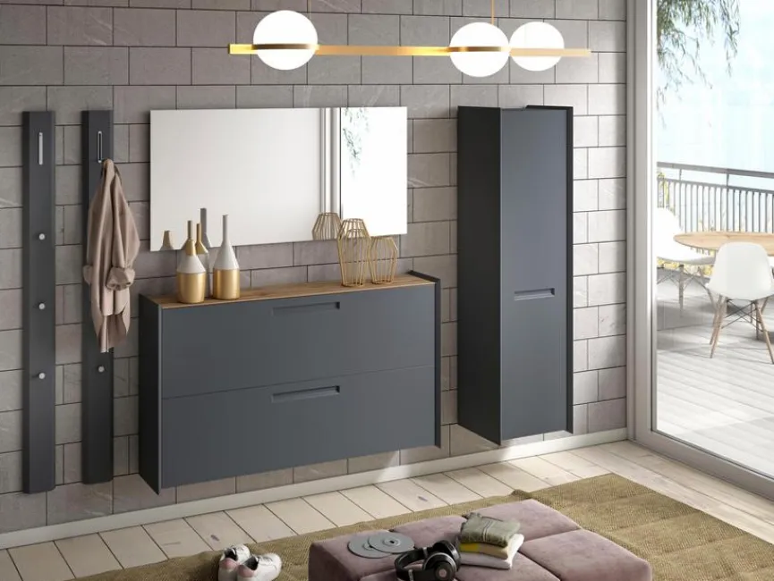 - Garderobe aus 2 Garderobenpaneelen, Hänge-Schuhschrank, Spiegel und Hänge-Mehrzweckschrank