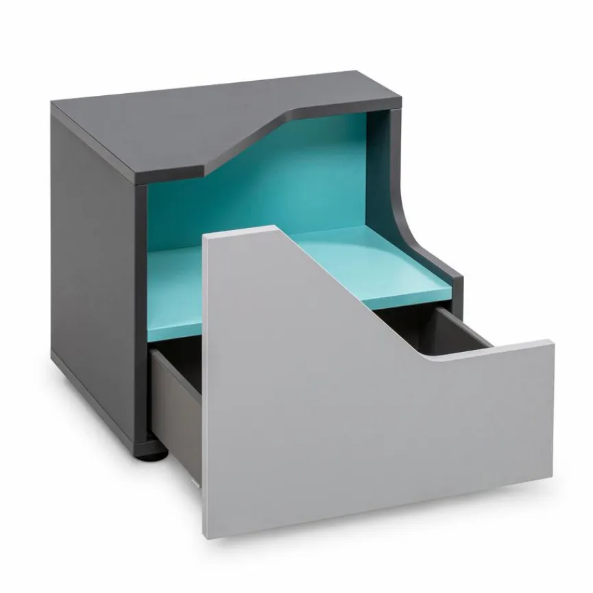 - Korpus aus Holzwerkstoff (Spanpatte) mit kratzfester Melaminharzfolie in Schiefergrau, Front aus Holzwerkstoff (Spanpatte) mit kratzfester Melaminharzfolie in Hellgrau, Absetzung aus Holzwerkstoff (Spanplatte) mit Lack in Türkis