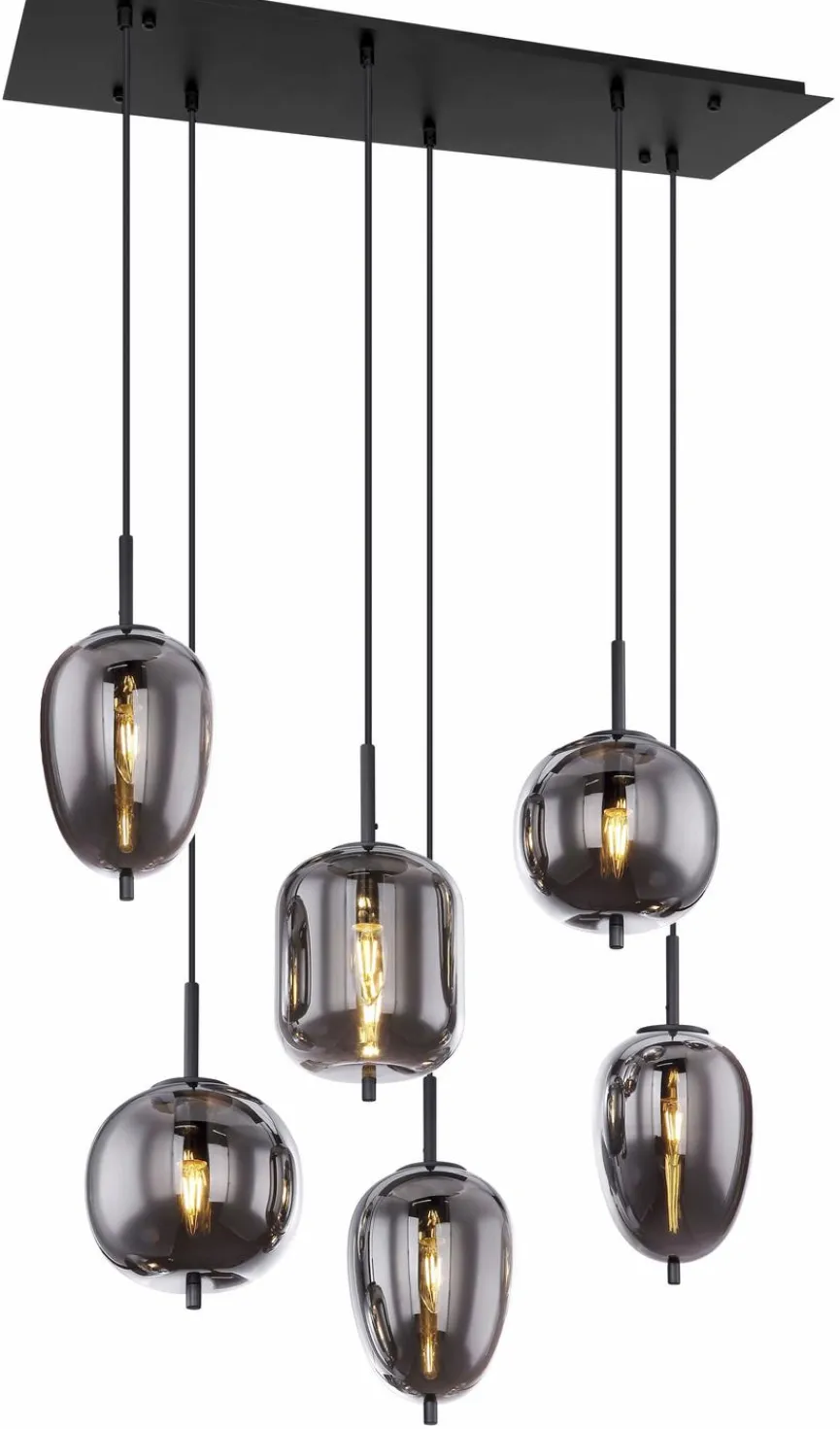 Lassen Sie Ihren Wohnbereich mit der Pendelleuchte Blacky von Globo in einem neuen Licht erstrahlen. Mit ihren sechs Glasschirmen in unterschiedlichen Formen schafft die Pendellampe eine faszinierende und einzigartige Atmosphäre. Die Pendelleuchte Blacky fügt sich nahtlos in verschiedene Einrichtungsstile ein und verleiht jedem Raum einen modernen Touch.