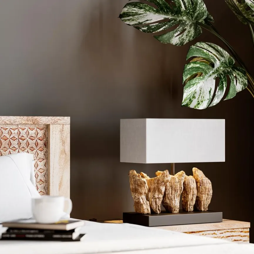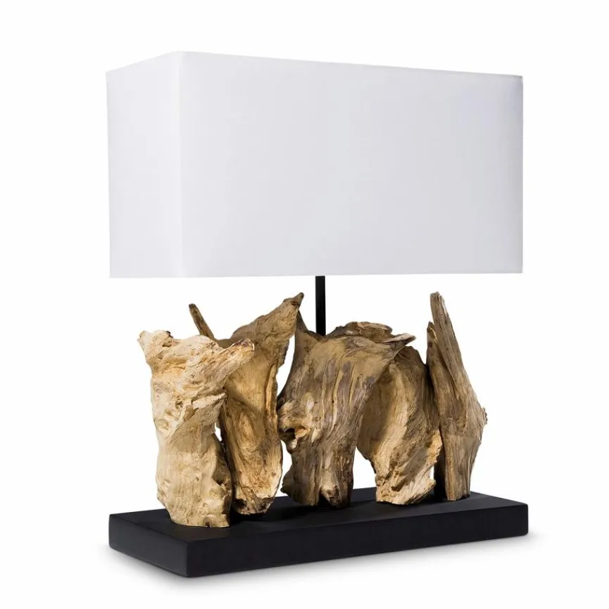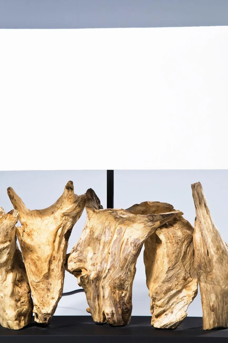 Tischleuchte Nature Vertical aus dem Hause KARE fasziniert, denn zwischen dem geradlinig gestalteten Schirm und dem flachen, quaderförmigen Sockel dieser Tischlampe befinden sich vom Meer geformte Elemente aus Treibholz. Sie bieten einen famosen Kontrast zu den strengen Geometrien und verleihen der Tischleuchte Nature Vertical von KARE ihre Einzigartigkeit.