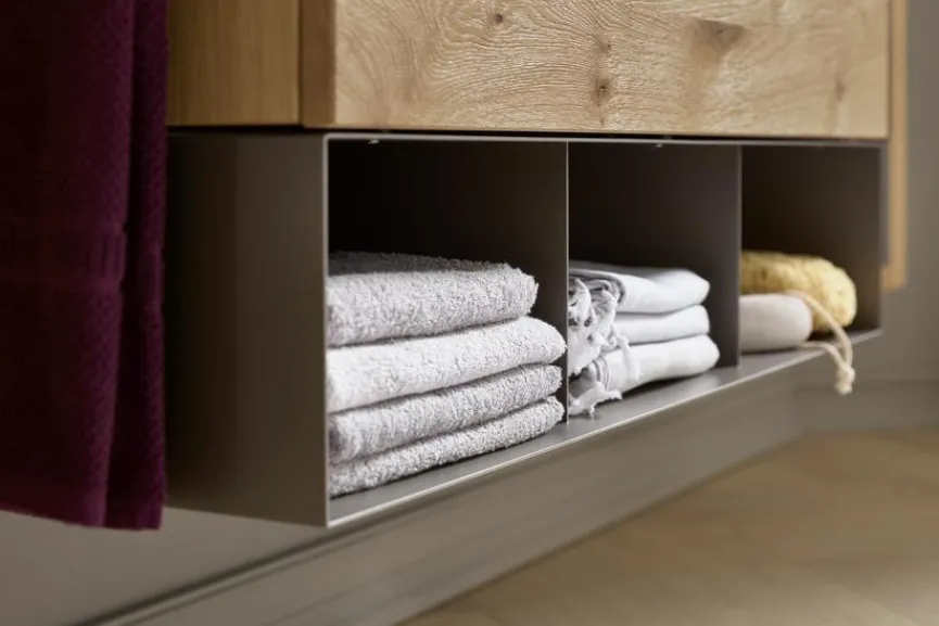 Die Waschtischkombination Jarin des Herstellers Musterring ist nicht nur ein funktionales Highlight, sondern wartet auch mit einem wohnlichen Design auf. Hierzu zählen Komponenten wie ein Keramikwaschbecken, eine Front mit Auszügen aus Massivholz und Colorglas sowie drei offene Fächer mit viel Stauraum für Ihre Badutensilien. Außerdem lässt sich die Waschtischkombination Jarin einfach an der Wand montieren.