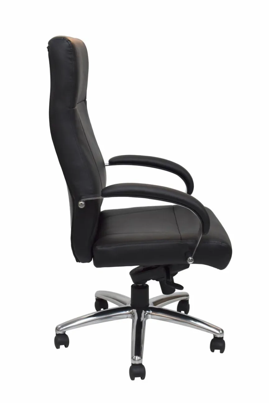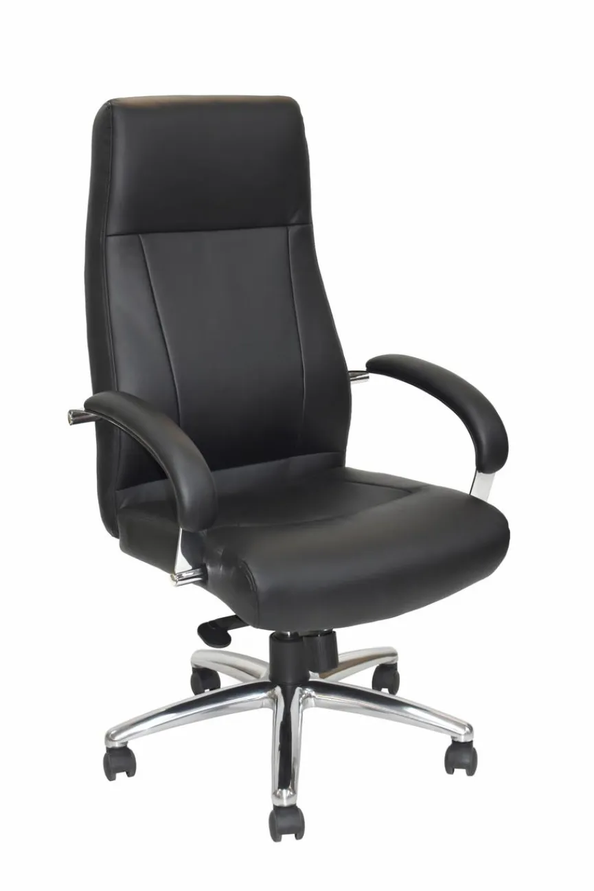 - Sitzfläche und Armlehnen aus Leder in schwarz, Rücken aus pflegeleichter Lederoptik in schwarz, Fußkreuz und gepolsterte Armlehnen aus Aluminium verchromt