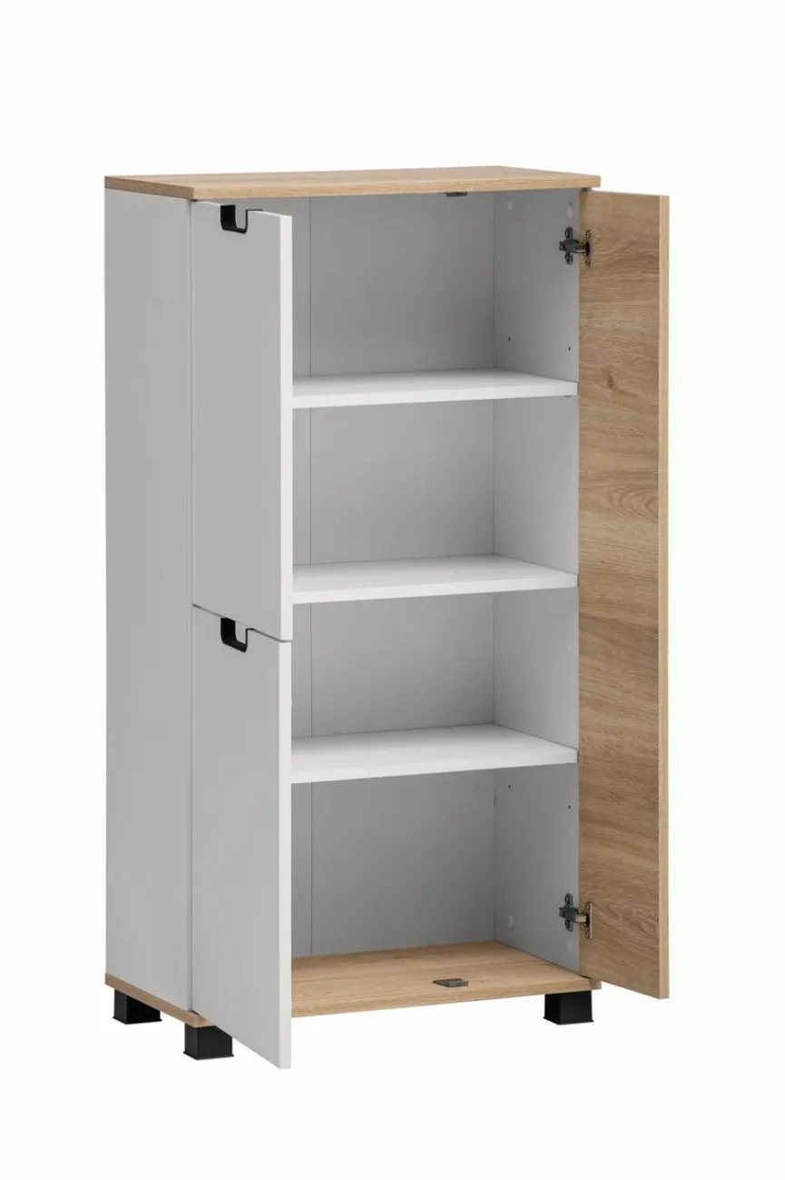 - Front und Korpus aus Holzwerkstoff (Spanplatte) mit kratzfester Melaminharzfolie in Weiß mit Akzent in Eiche hell