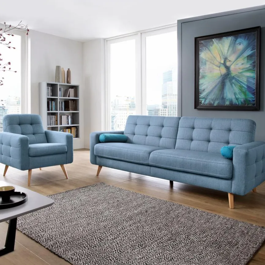 - Bezug aus Stoff in blue, Füße aus Massivholz in Buche natur