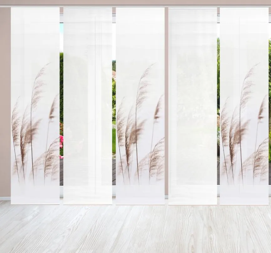 - Artikel beinhaltet zwei unifarbene und drei gemusterte Schiebevorhänge, Paneelwagen inkl. Gleiter und Aluklemmleiste