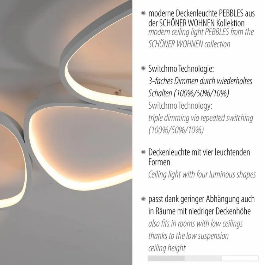 Die LED-Deckenleuchte Pebbles aus der SCHÖNER WOHNEN-Kollektion steht für eine stilvolle Beleuchtung mit moderner Technik und schafft ein harmonisches Ambiente. Ihr sanftes, dimmbares Licht betont alle Räume mit zeitloser Schönheit und technischer Raffinesse. Durch die integrierte Memoriefunktion bietet die LED-Deckenleuchte Pebbles Komfort und Flexibilität, wie sie nur eine besonders hochwertige LED-Deckenlampe bieten kann.