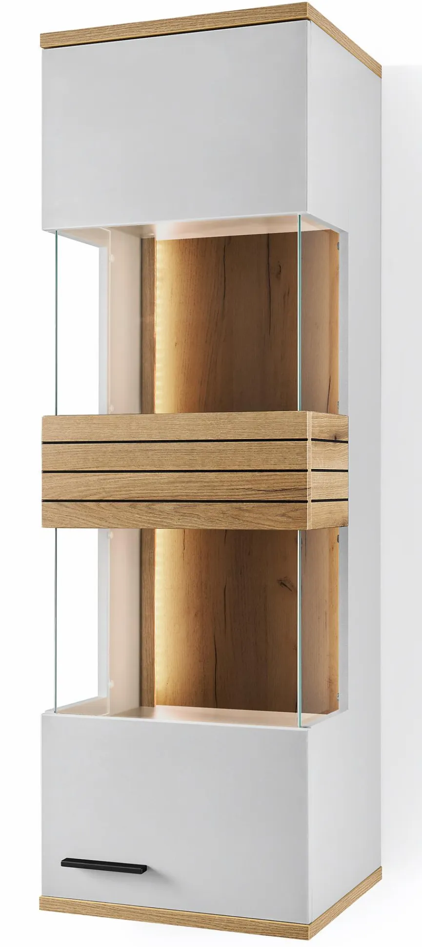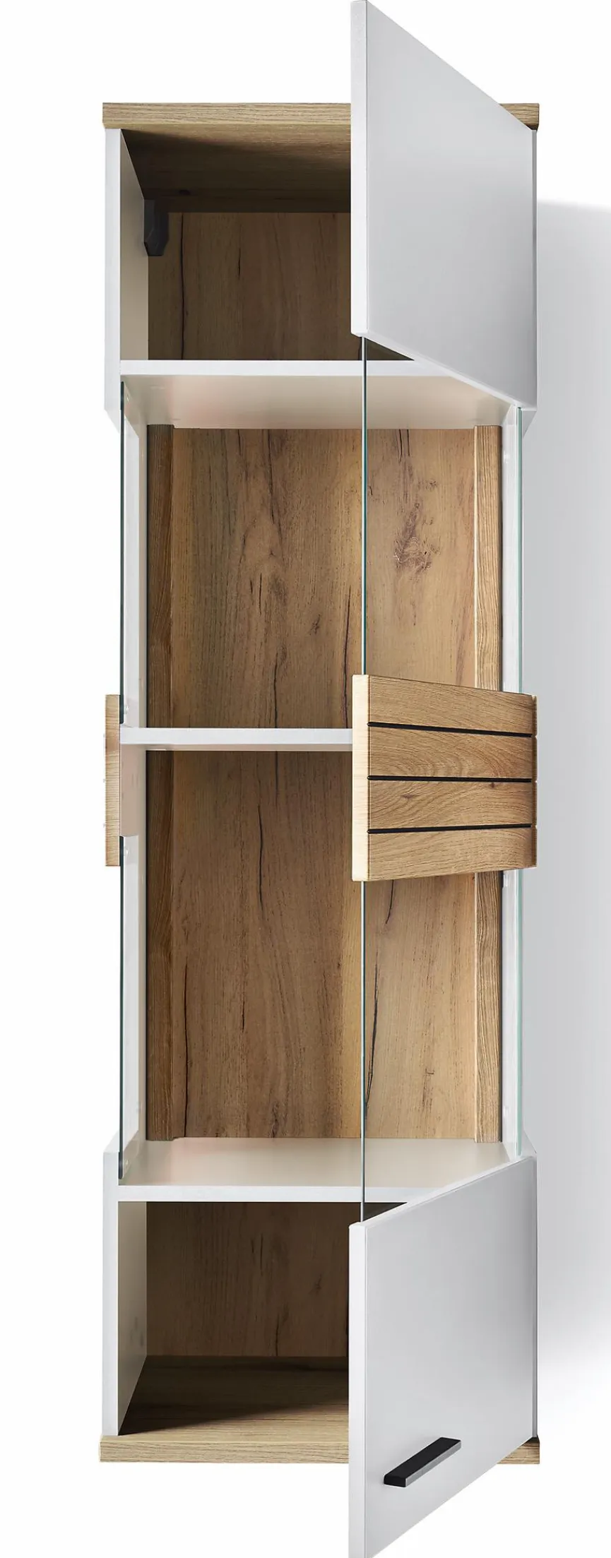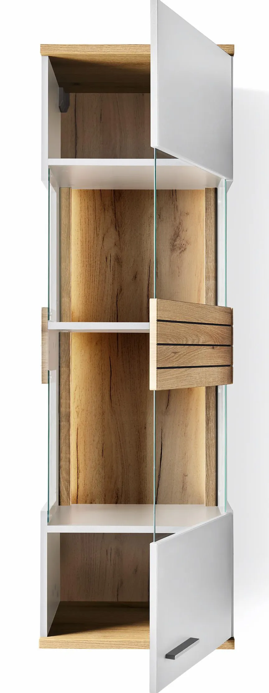 - Front mit Lamellen aus Holzwerkstoff (MDF) mit hochwertiger Dekorfolie in Coast Evoke Eiche, Front aus Holzwerkstoff (Spanplatte) mit kratzfester Melaminharzfolie in Lichtgrau