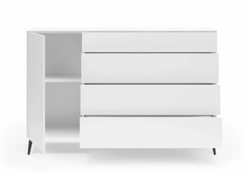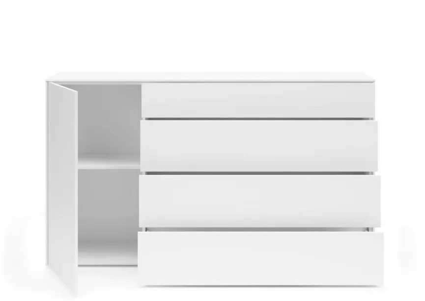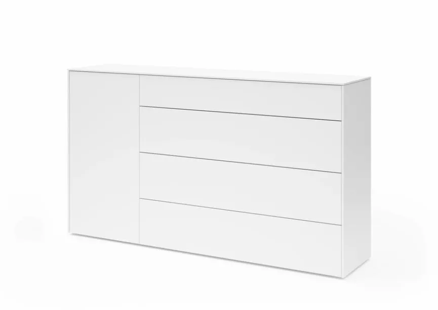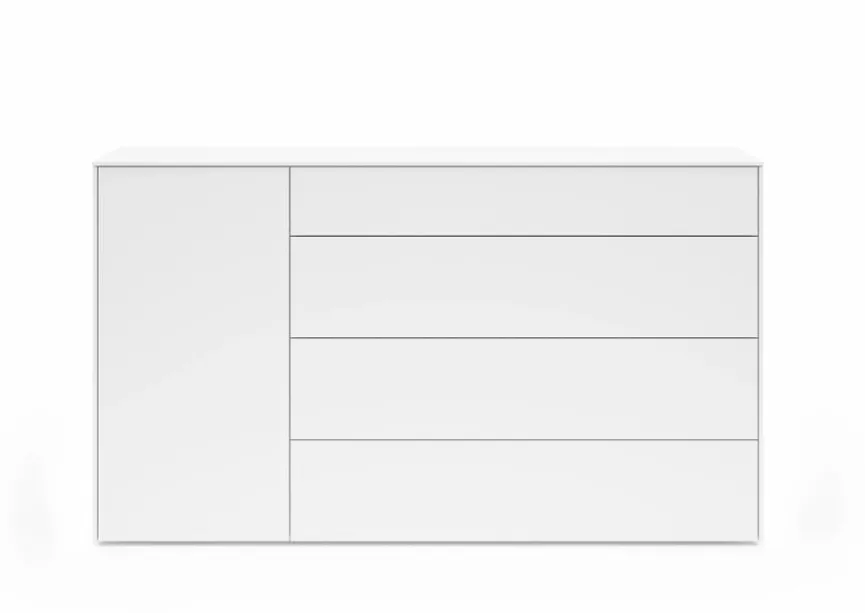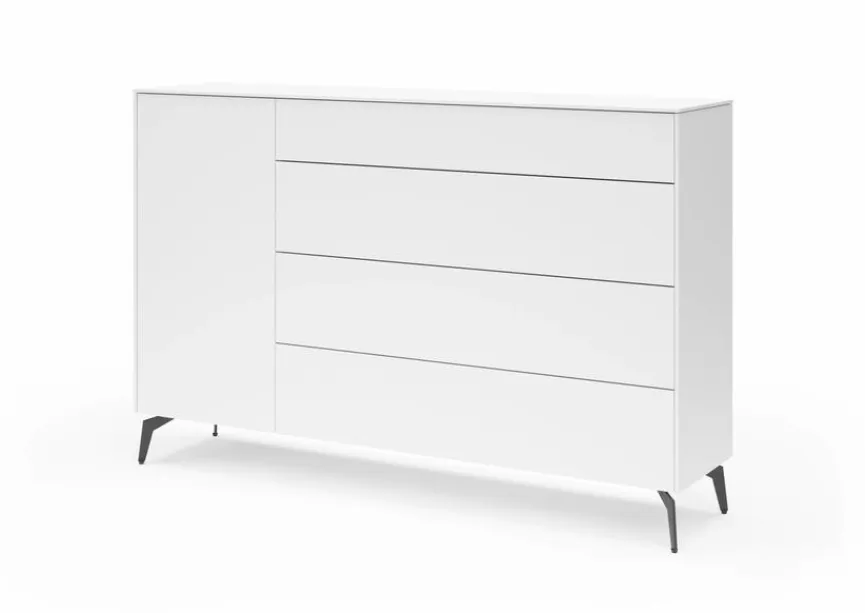 Dezente Eleganz und zeitlose Optik zeichnen die Kommode Riverside von set one by Musterring aus. Hinter einer Tür und in vier Schubladen findet sich reichlich Platz, um Geschirr, Tischwäsche, Accessoires oder andere liebgewonnene Dinge aufzubewahren. Dank der schlichten Farbgebung und der klaren Form passt die Kommode Riverside zu jedem modernen Einrichtungsstil.