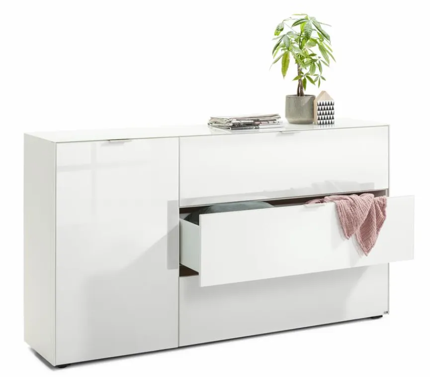 - Aus Holzwerkstoff (Spanplatte), Korpus mit kratzfester Melaminharzfolie in weiß matt, Front und Oberplatte aus Glas weiß glänzend lackiert