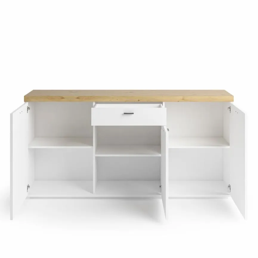Das Sideboard Lancaster der Marke set one by Musterring ist eine Bereicherung für Ihr Wohnzimmer. Dank des schlichten Designs fügt es sich perfekt in die Wohnumgebung ein. Ein besonderes Highlight ist die sich auf der Kommode befindliche eingerahmte Milchglasplatte, die mit einer LED-Beleuchtung ausgestattet ist. Durch die Melaminharzfolie ist das Sideboard Lancaster kratzfest und einfach zu reinigen.
