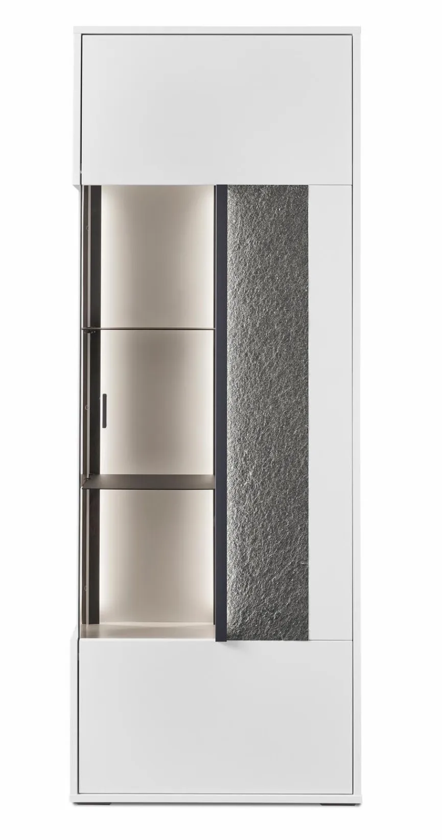 - Korpus und Front aus Holzwerkstoff (Spanplatte) mit kratzfester Melaminharzfolie in Weiß Matt, Absetzung aus Steinfurnier in Black Pearl-Sandstone