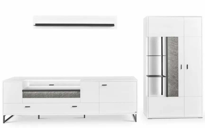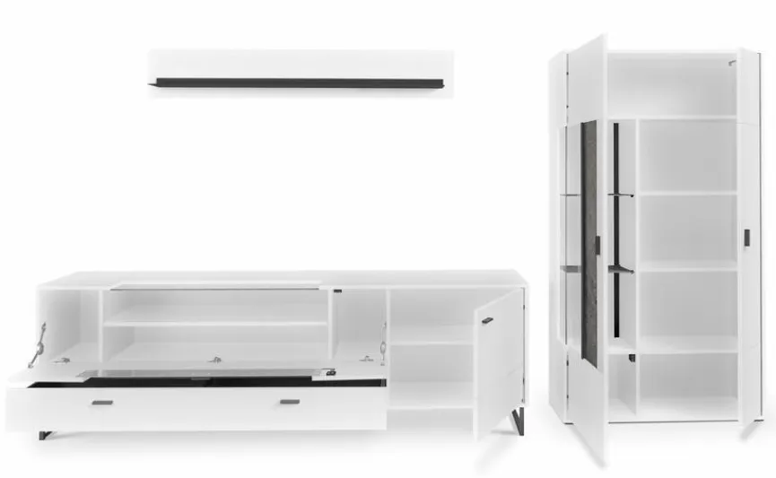 - Bestehend aus Vitrine, TV-Lowboard und Wandboard