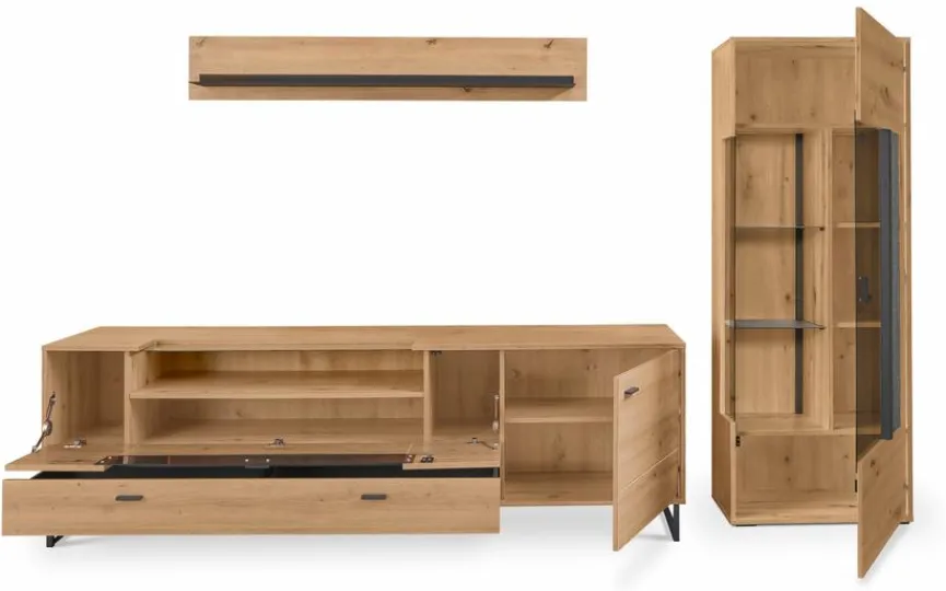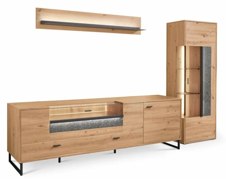 - Bestehend aus Vitrine, TV-Lowboard und Wandboard