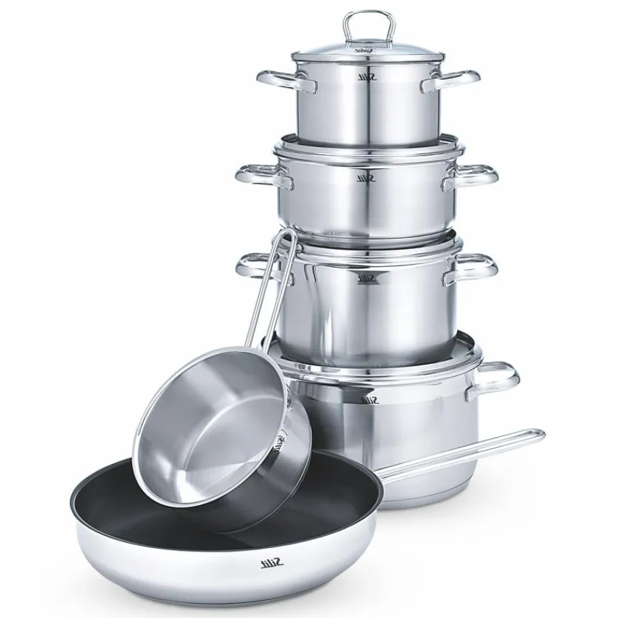 - Artikel beinhaltet 3x Kochtopf mit Deckel Ø 16, 20, 24 cm und 1x Bratentopf mit Deckel Ø 20 cm, Stielkasserolle Ø 16 cm und Stielpfanne Ø 28 cm