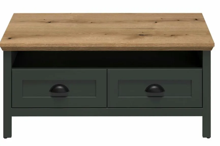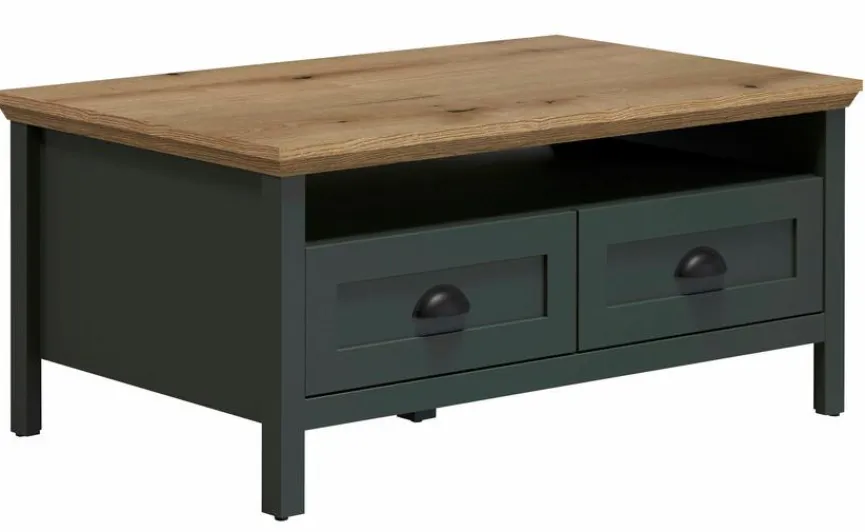 - Korpus und Rückwand aus Holzwerkstoff (Spanplatte) mit hochwertiger Dekorfolie in Tannengrün, Front aus Holzwerkstoff (MDF) mit hochwertiger Dekorfolie in Tannengrün, Tischplatte aus Spanplatte mit hochwertiger Dekorfolie in Evoke Eiche Nachbildung