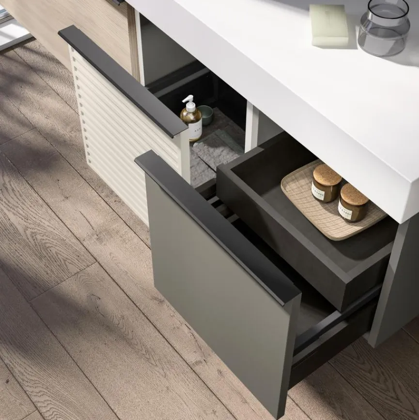 - Waschtischunterschrank mit 1 Auszug mit der Fronttype Plain in Ulme Rousseau, inkl. Griffleiste in schwarz matt