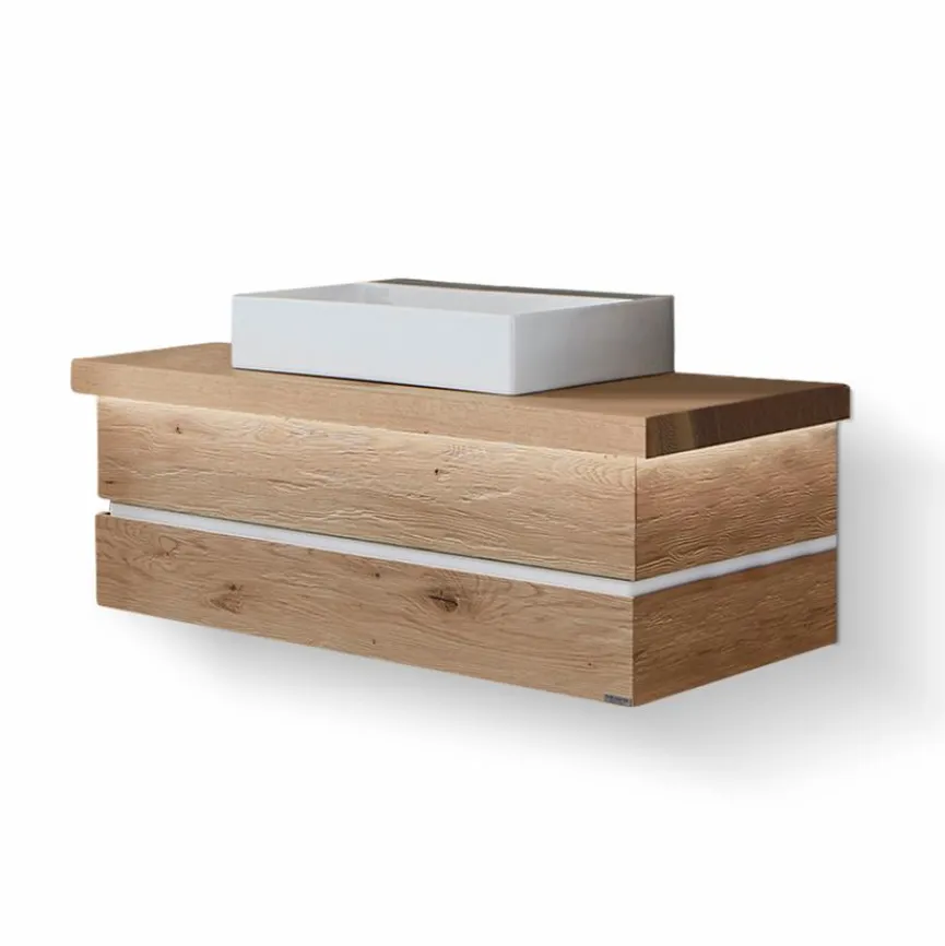 - Waschtisch aus Massivholz Eiche mit Aufsatzbecken in Keramik weiß mit Armaturbohrung und Überlauf, 1 Raumsparsiphon und 1 Permanentablauf inkl. Abdeckung in chrom